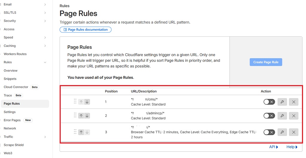 Bước 1: nếu bạn đã tạo các page rules thì hãy disable hết để tránh xung đột khi tạo các cache rules.