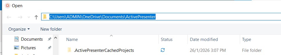 Khi open nó sẽ hiện ra vị trí chọn nơi mở project và bạn hãy copy đường dẫn bôi đen như hình và mở nó ra sẽ thấy tên thư mục .ActivePresenter…. như hình dưới => thường mờ hơn các thư mục còn lại thì chính xác nó chính là nơi lưu trữ file tạm